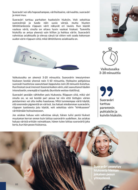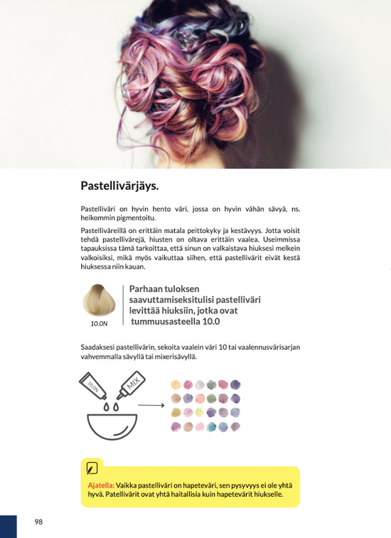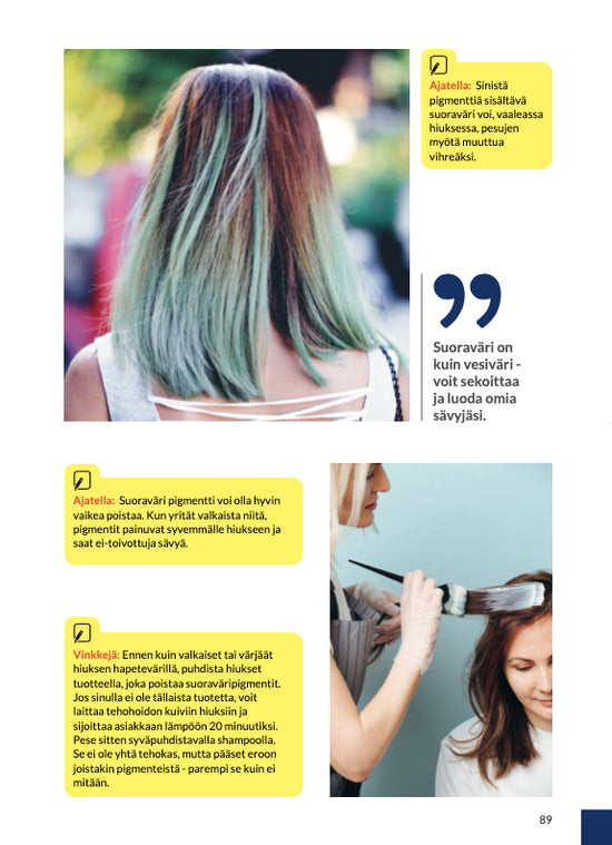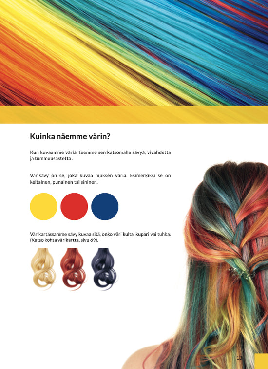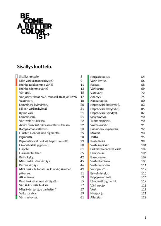 Haluatko myös tulla yhdeksi parhaista värintekijöistä? Sitten kirja on hyvä alku tälle matkalle. Se on suunniteltu helppolukuiseksi, selkeäksi ymmärrettäväksi ja hauskaksi käytettäväksi. Ei ole väliä oletko opettaja, opiskelija, kouluttaja tai edes myyjä kampaamoalalla, kirjasta on apua. Kirja sisältää monia vinkkejä ja ajateltavaa, jotka auttavat sinua tuntemaan olosi itsevarmemmaksi ja turvallisemmaksi väritystyössäsi. Kirja on täysin tuoteneutraali, joten voit käyttää kirjasta saatua tietoa missä tahansa järjestelmässä, jossa työskentelet.