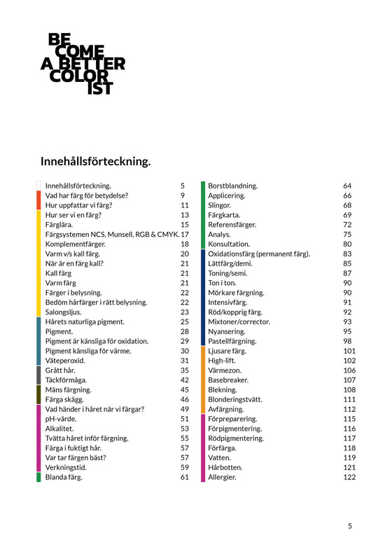 Vill du också bli en av dem bästa coloristerna? Då är boken en bra början på den resan. Den är designad för att vara lätt att läsa, tydlig att förstå samtidig som det skall vara kul att använda den. Det spelar ingen roll om du är lärare, student, utbildare eller till och med säljare inom frisörbranschen så kommer boken vara till hjälp. Boken innehåller många tips och att tänka på som hjälper dig så du kan känna dig mer säker och trygg i dina färgningar. Boken är helt produktneutral så du kan använda kunskapen från boken till vilket system du än jobbar med.